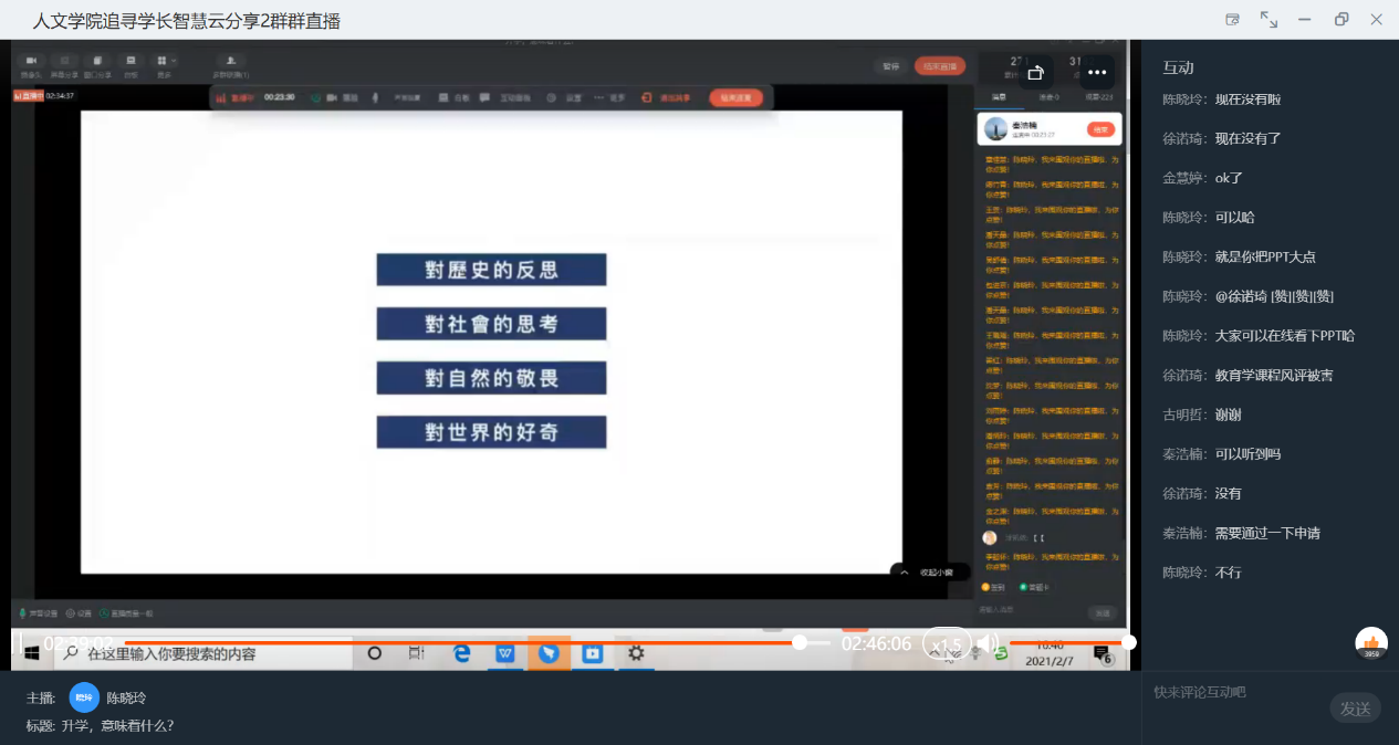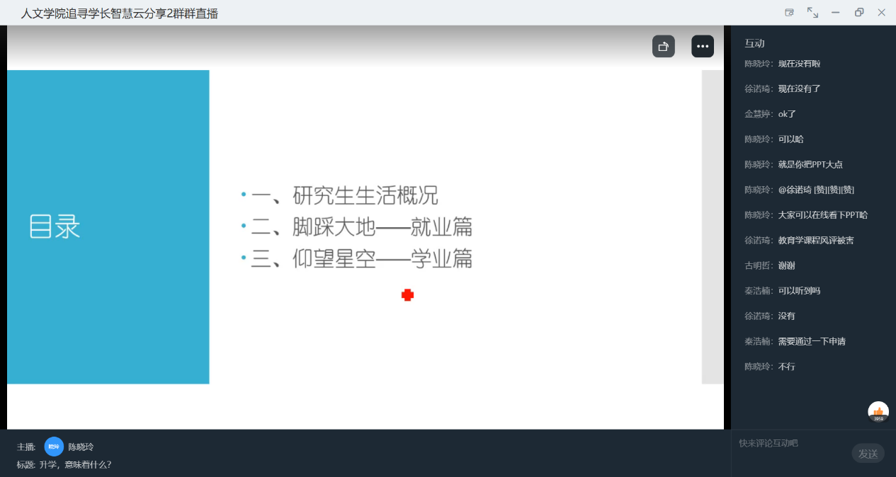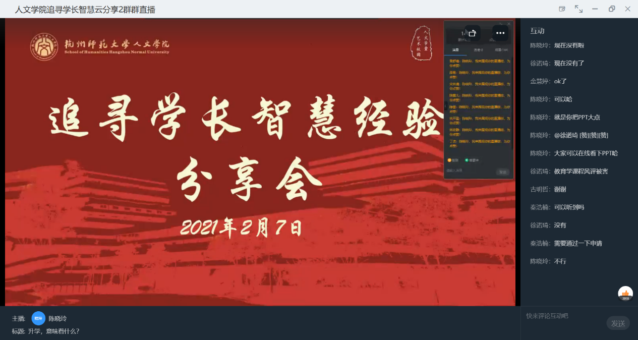 2021年2月7日14:00,色情网站 于钉钉平台顺利举办追寻学长智慧之经验分享会系列讲座——“升学,意味着什么?”。讲座由由色情网站 学工办主任陈晓玲主持。本次讲座共有270人参加,点赞数高达3960次。