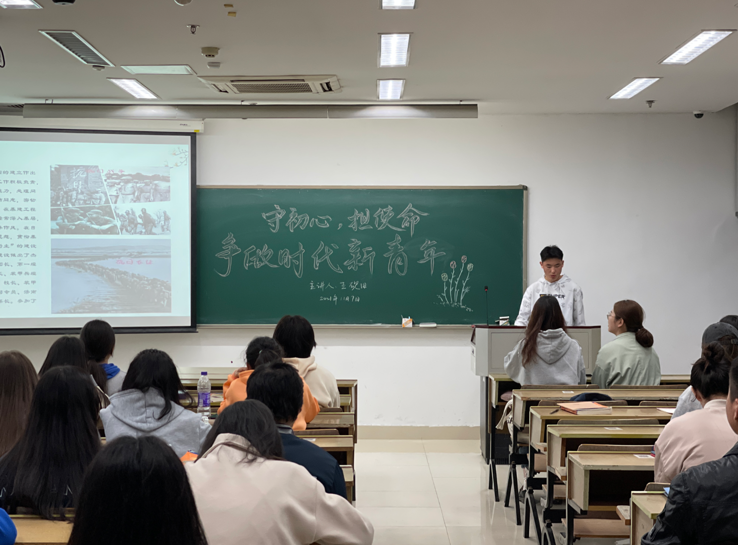 为了厚植同学们的爱国情怀,11月7日18:00点,预科211班在恕园11号楼309教室开展“每日一讲”活动。此次活动由中文191施颖学姐主持,叶斯力同学演讲,预科211全体学生参与。