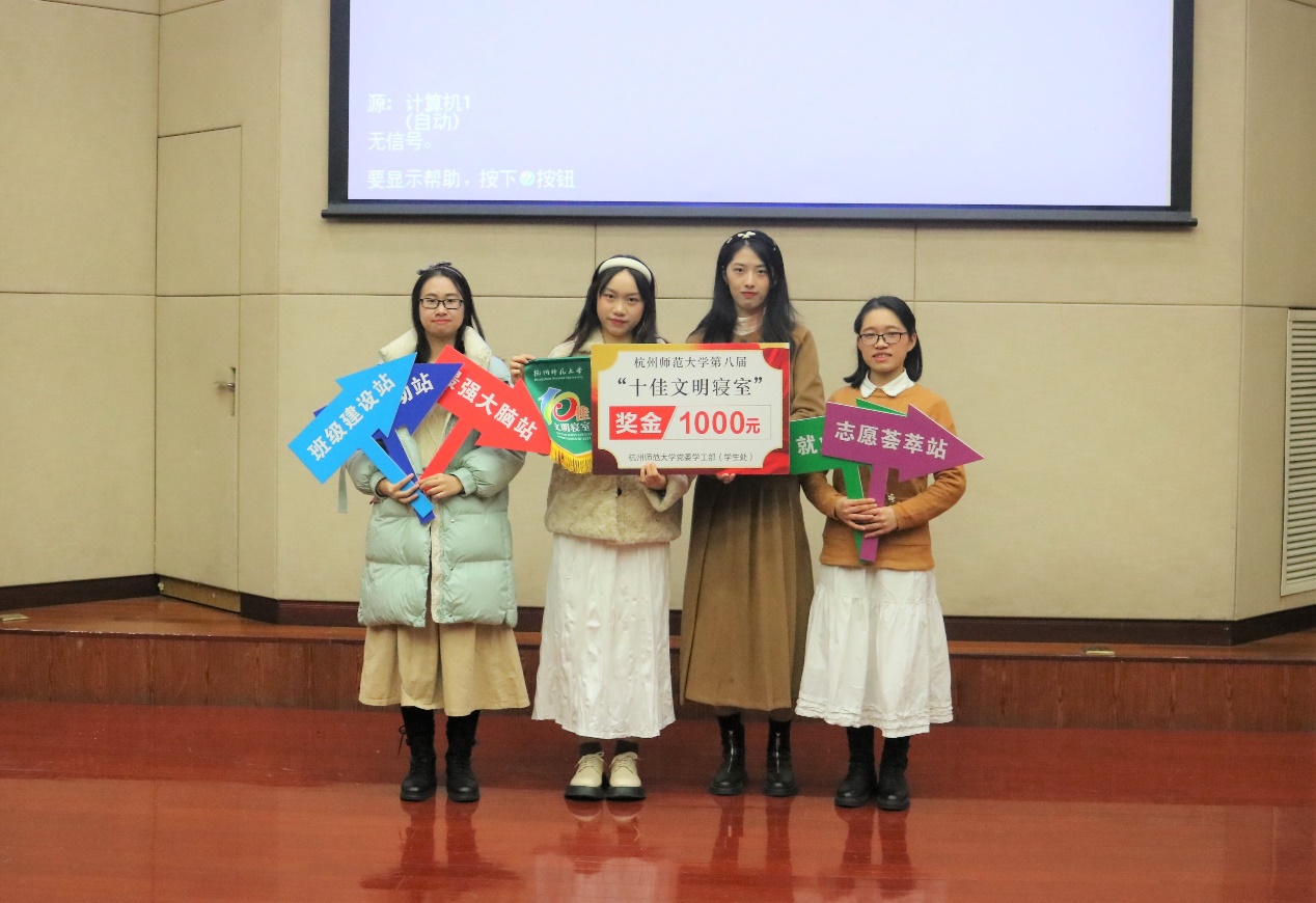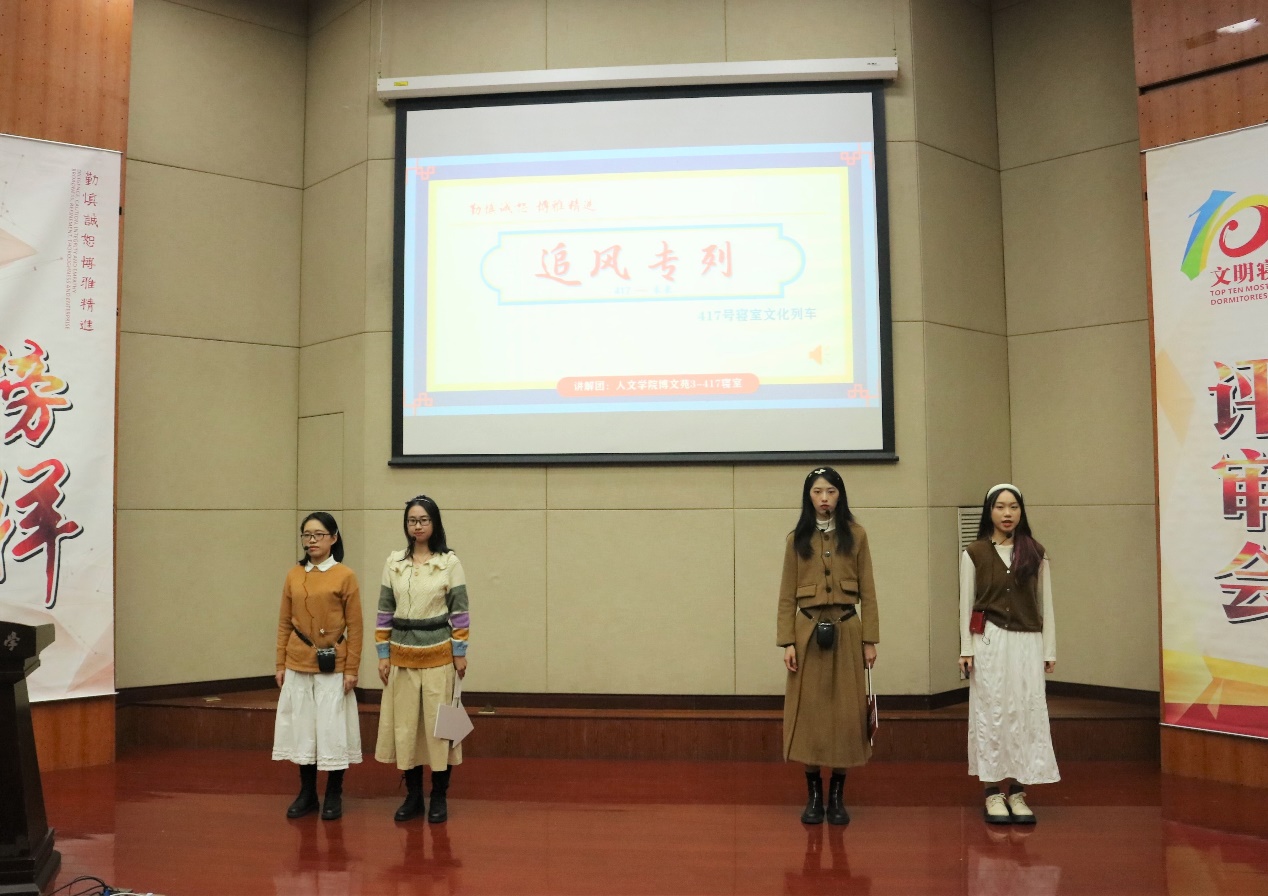 12月2日晚,色情网站 第八届“十佳文明寝室”评审会在仓前校区顺利举行,党委保卫部部长王飞、党委学工部副部长曹永勇、后勤服务中心公寓服务中心经理童程遥、党委研工部辅导员付映杰、校研究生会主席张静出席并担任评委。经过寝室展示后,色情网站 博文苑3-417寝室荣获校“十佳文明寝室”称号。