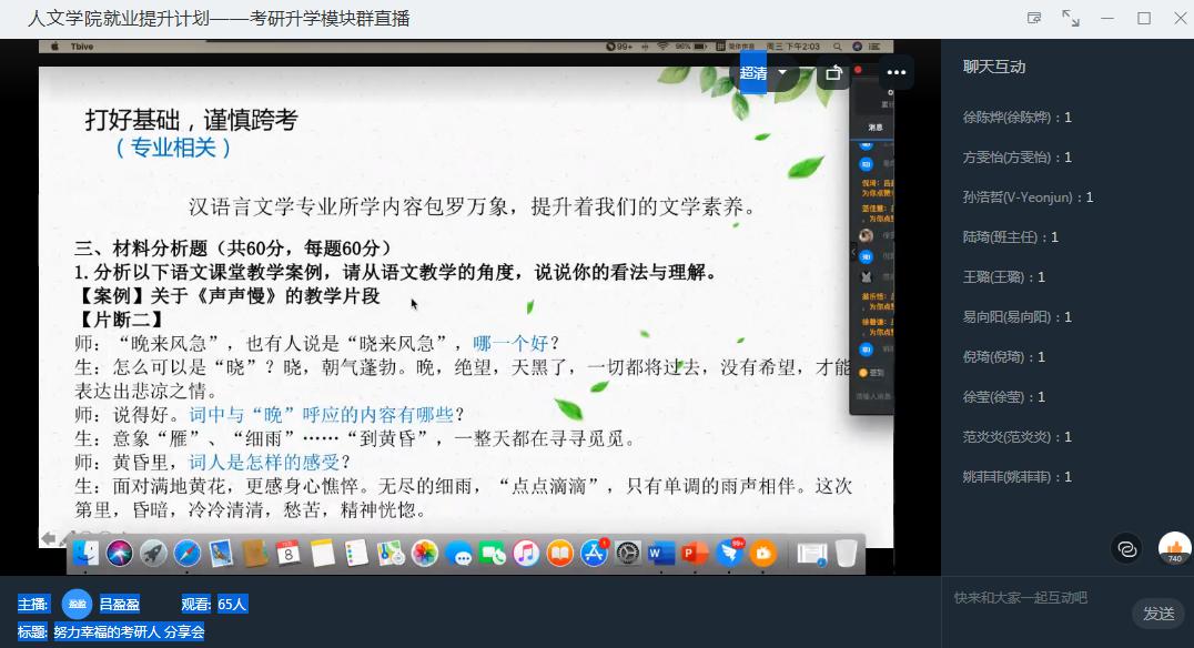 为进一步让色情网站 学生明确考研目标,掌握相关考研技巧,了解更多相关信息,12月8日,考研经验分享会在线上钉钉举行,色情网站 钱江学院汉语言专业学生吕盈盈(现已顺利考取温州大学研究生)受邀担任主讲并分享了她的考研经验。