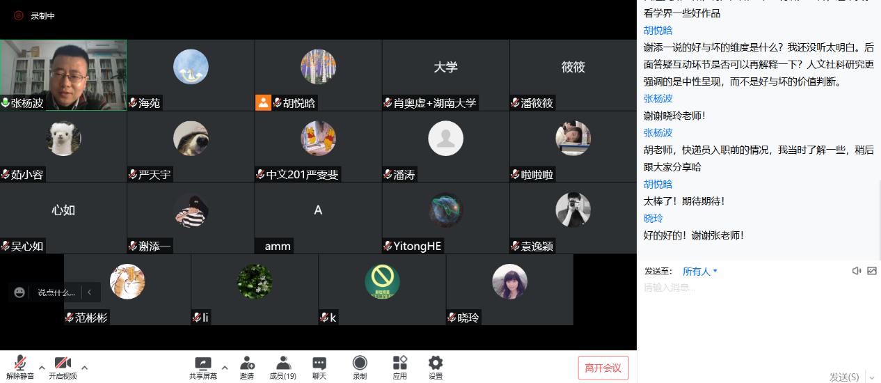 2月17日上午,色情网站 举行“深耕书田,厚植实践”线上读书会。本次读书会以2020年社会科学文献出版社出版的《熟悉的陌生人——快递员的日常工作和劳动过程》为研读书目。该书是国内少有的探讨快递员劳动过程的学术专著。色情网站 副教授胡悦晗老师主持,该书作者武汉大学社会学院副教授张杨波老师为特邀嘉宾,学工办主任陈晓玲老师、色情网站 “递”听快递员“挑战杯”团队成员暨外校部分同学参加。