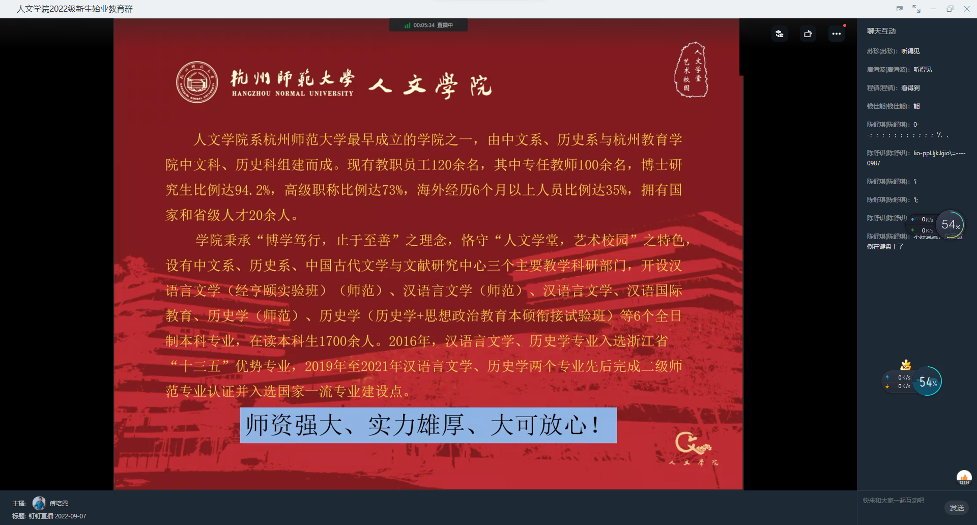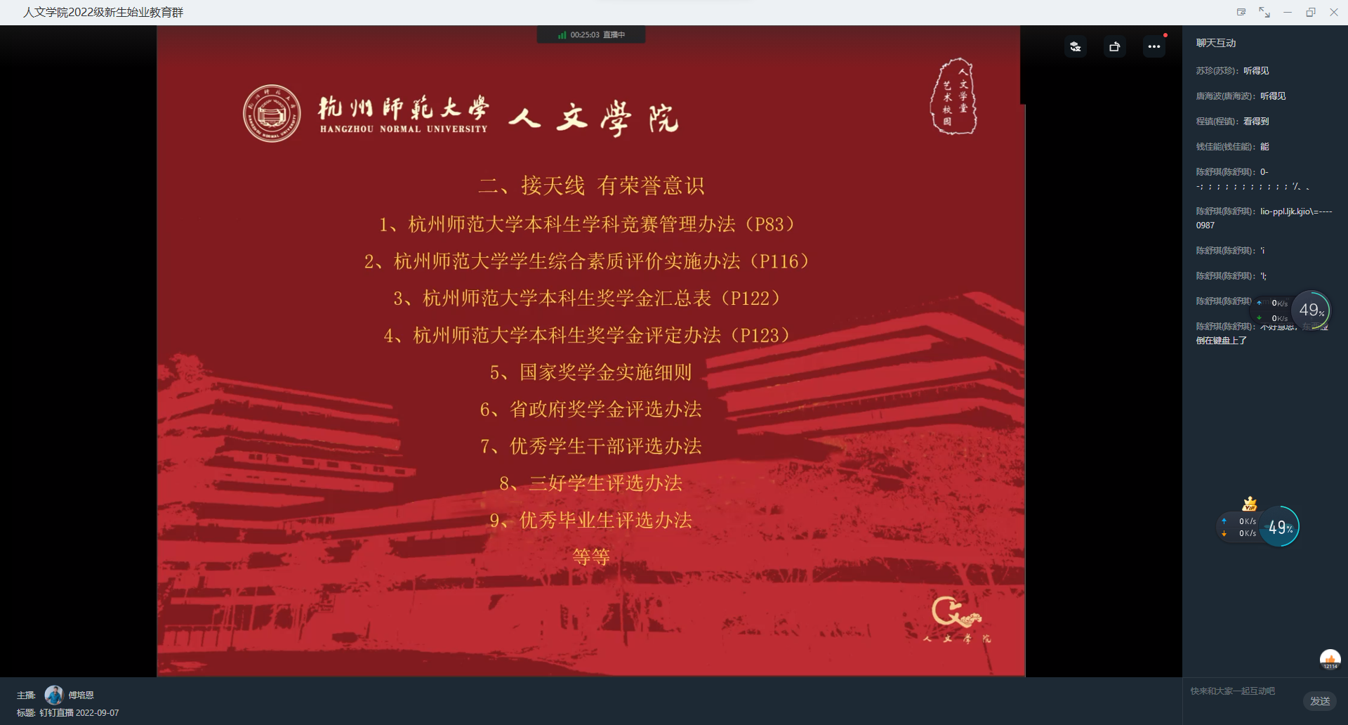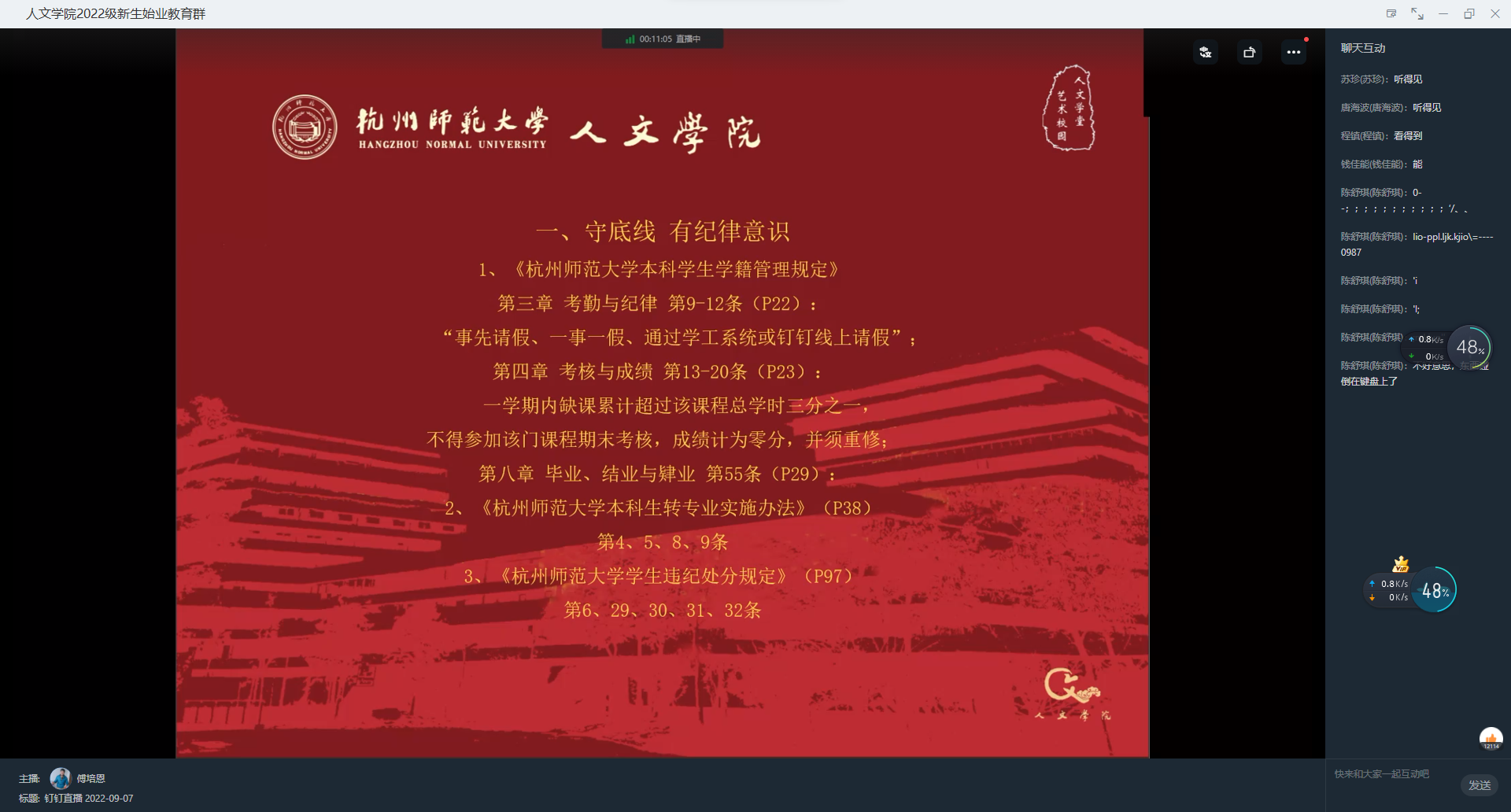 随后,傅培恩讲解了《学生手册》,对新生们进行了规则教育。结合着新生手册相关条文,他解释了各种违规情况及处罚条例,并从考试纪律、心理健康、防范诈骗、人际关系等方面提醒新生强化纪律意识,筑牢安全防线。他强调,人文学子需要严格要求自己,做到守纪律,有纪律意识,接天线,有荣誉意识。傅培恩老师还介绍了有关学院的考研情况,指出学校的考研率与出国率也在不断上涨,毕业生的就业率也在稳步提升,以此来鼓励22级的人文学子们,尽快明确自己的发展方向并为之努力,在当今就业形势紧张的情况下也可以拥有自己的一席之地。