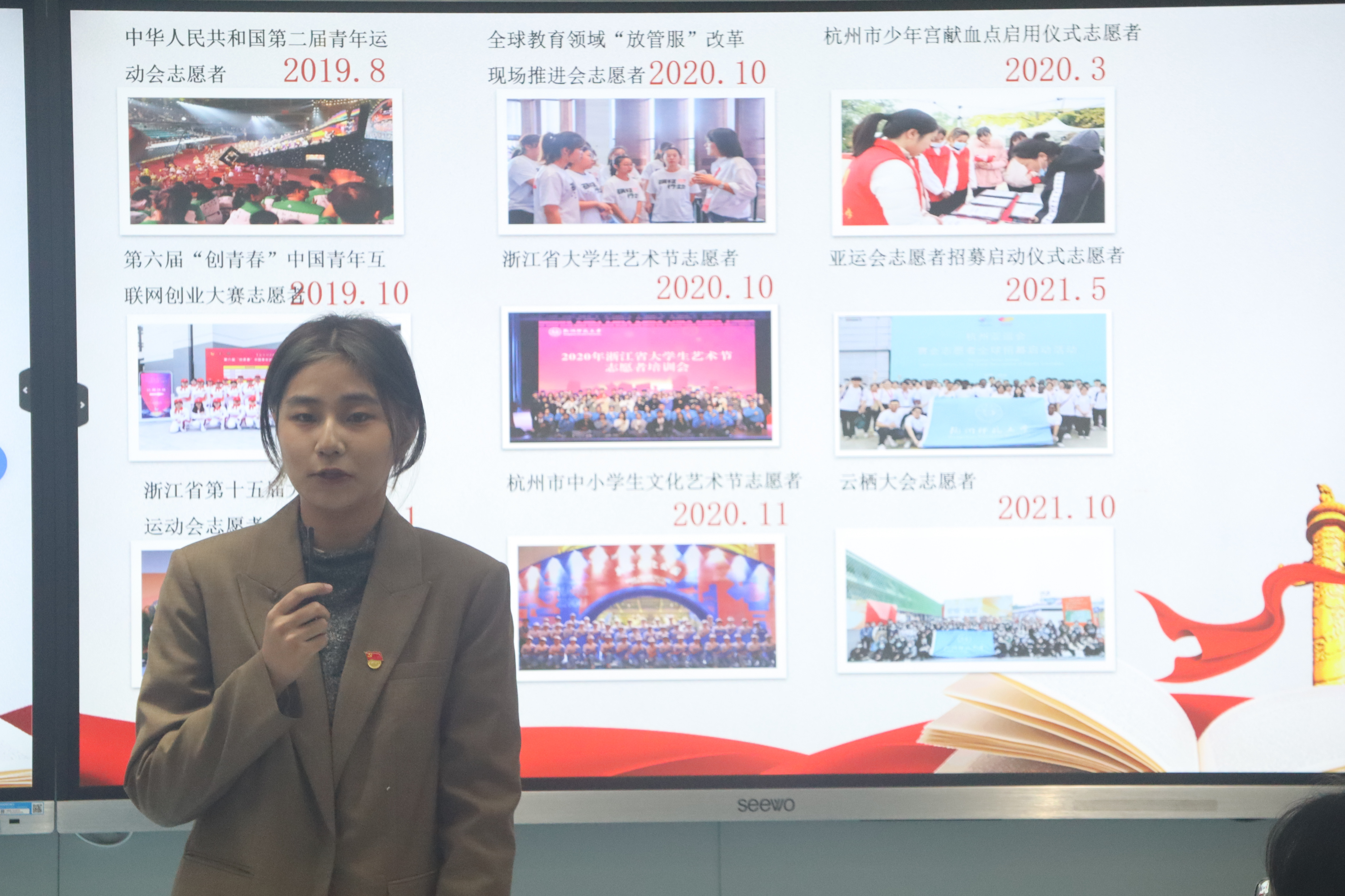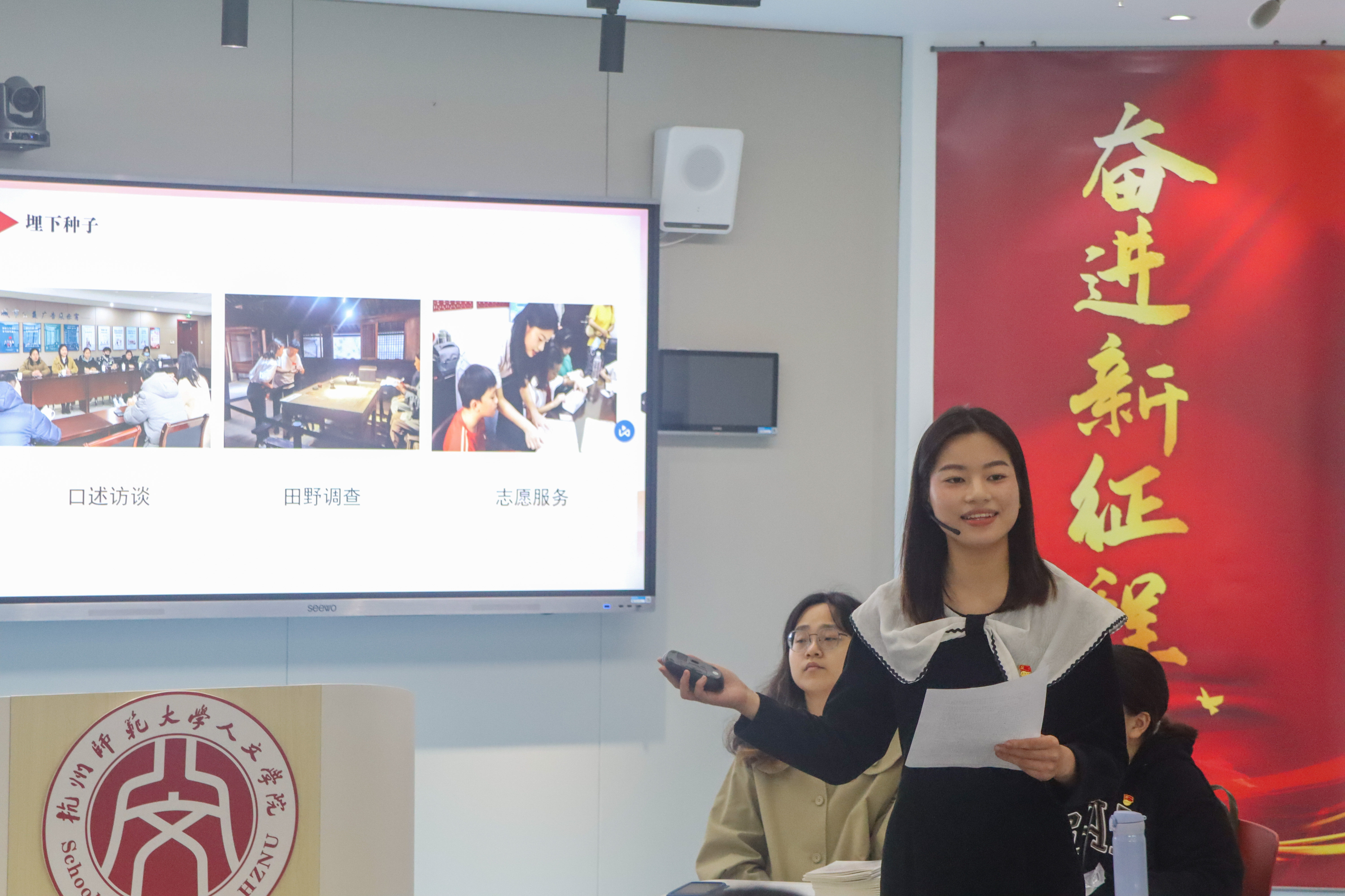 会议伊始,本科生第一党支部党员代表作了党的二十大精神学习专题报告。本科生第一党支部学生党员陈佳滢作为色情网站 “耕远”文化团队负责人、杭州市金牌宣讲员,结合自己带领“耕远”文化团队和“莓美与共”实践团队口述访谈、田野调查、志愿服务等的具体实践,详细阐述了她对习近平总书记在党的二十大报告中关于当代中国青年相关论述的理解。曾任色情网站 青年志愿者协会会长、获得“浙江省优秀共青团员”称号的本科生第一党支部学生党员殷沁雅结合自身志愿服务经历,分“以青春之我担时代之任”、“以奋斗之姿与时代逐梦”、“以青春梦想书写新时代篇章”三部分论述了自己对习近平总书记在党的二十大报告中对新时代青年寄语的理解,进一步呼吁广大青年“让青春在全面建设社会主义现代化国家的火热实践中绽放绚丽之花”。