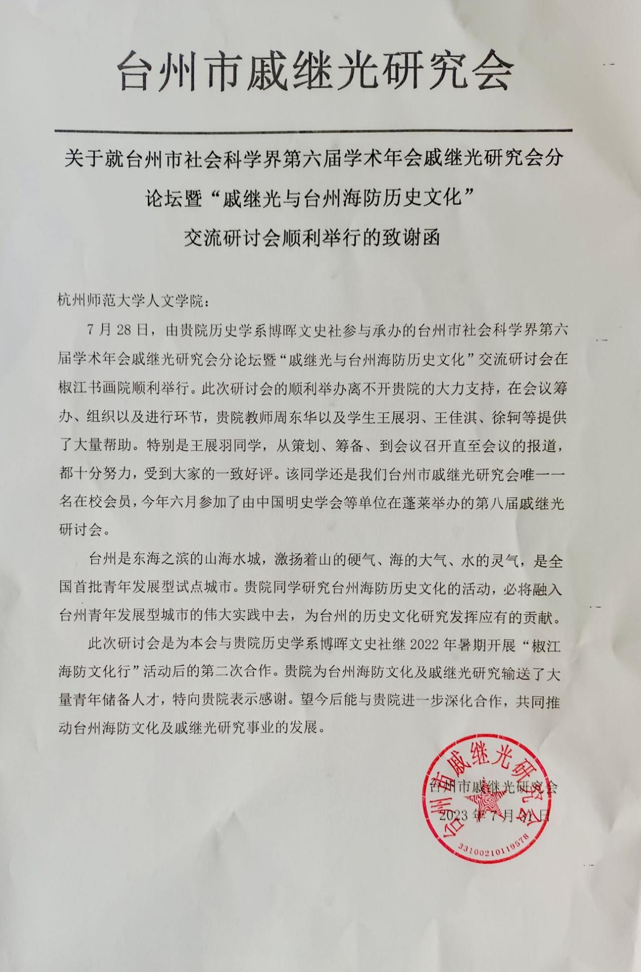会后,台州市戚继光研究会还向色情网站 发来致谢函,感谢色情网站 师生在此次会议中所做出的贡献,并表示希望同色情网站 师生进一步深化合作,共同推动台州海防文化及戚继光研究事业的发展。
