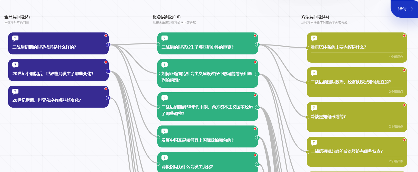 为方便学生在课程学习中明确学习目标、检验学习所得,知识图谱共设计3个全局层问题、10个概念层问题、44个方法层问题。
