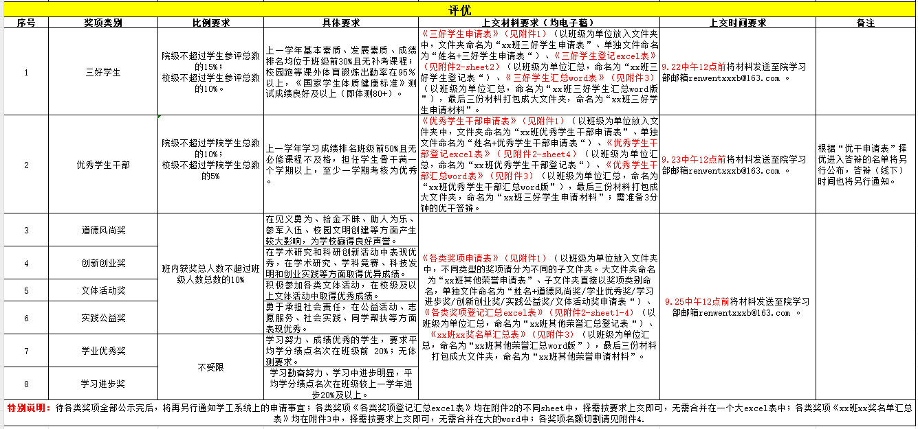1.各班级要充分认识做好学生评奖评优工作的重要性,要严格按照“评选条件公开、评选名额公开、程序办法公开、评选结果公开”的原则做好各项评选工作,评选过程中要严格按照相关制度和规范流程执。