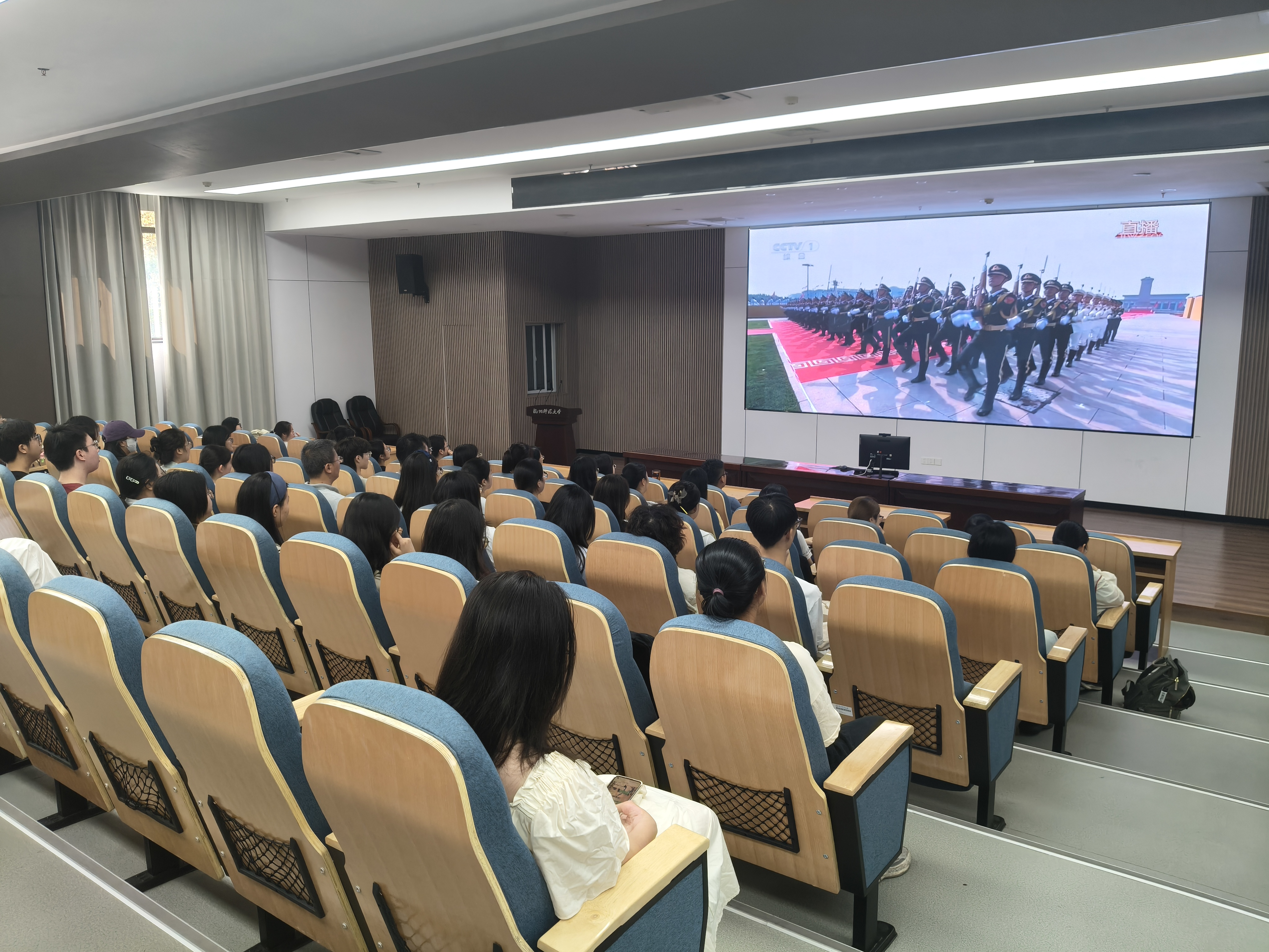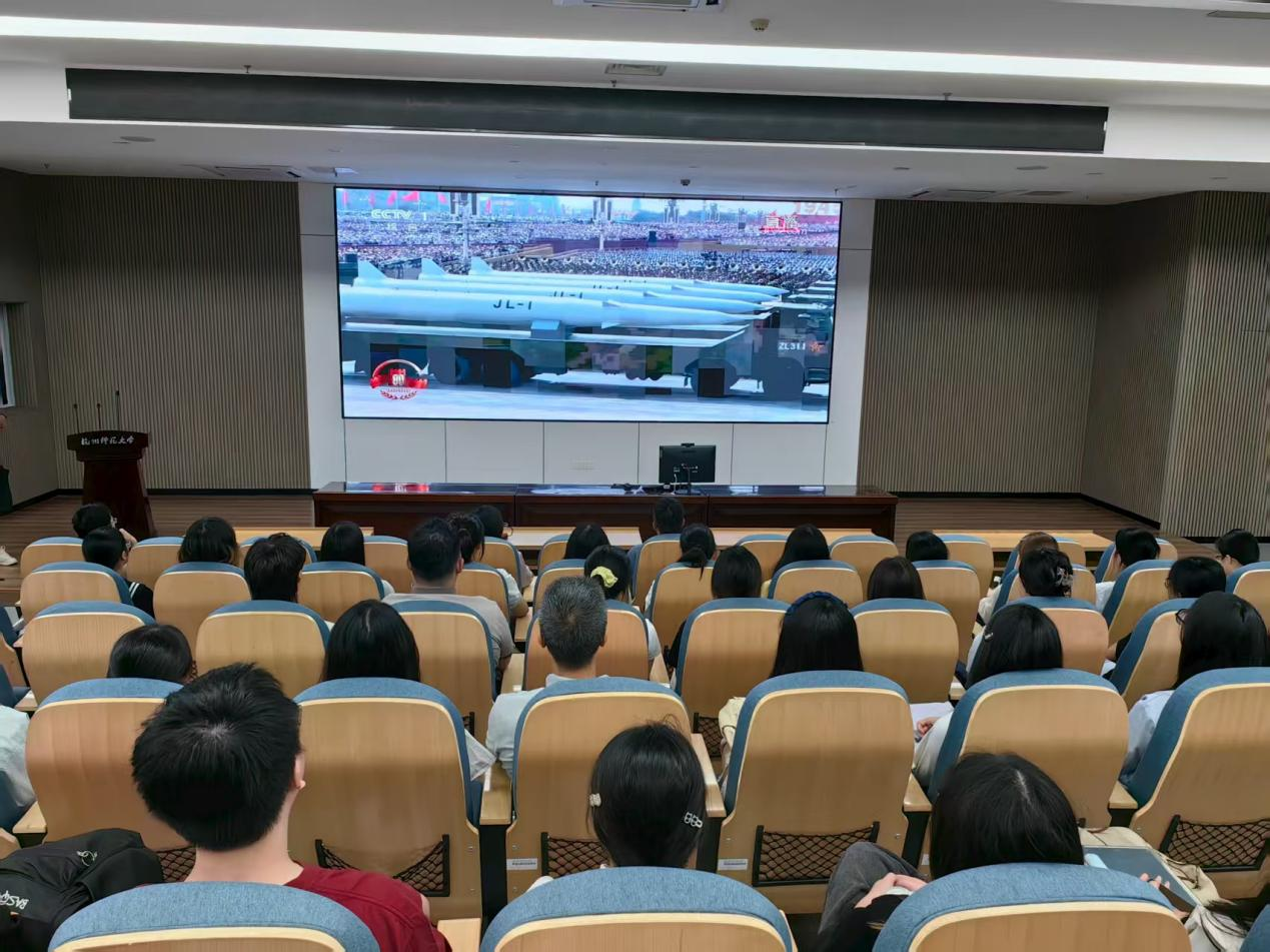 在观看过程中,师生们神情庄重、精神昂扬,每到精彩之处自发响起热烈掌声。三军浩荡,声如千骑疾;铁甲生辉,气卷万山来。受阅部队威武雄壮的强大阵容、昂扬奋进的崭新风貌和一往无前的磅礴气势,深深地感染了在场的每一个人。活动结束后,同学们纷纷表示深受教育和鼓舞。一位观看学生激动地表示:“当一面面写满功勋的战旗迎风而来,我深刻体会到‘正义必胜、和平必胜、人民必胜’的真理,更加坚定了早日加入中国共产党的决心。”