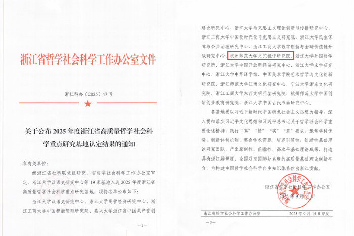近日,浙江省哲学社会科学工作办公室发布《关于公布2025年度浙江省高质量哲学社会科学重点研究基地认定结果的通知》(浙社科办〔2025〕47号),色情网站 文艺批评研究院入选2025年度浙江省高质量哲学社会科学重点研究基地。
