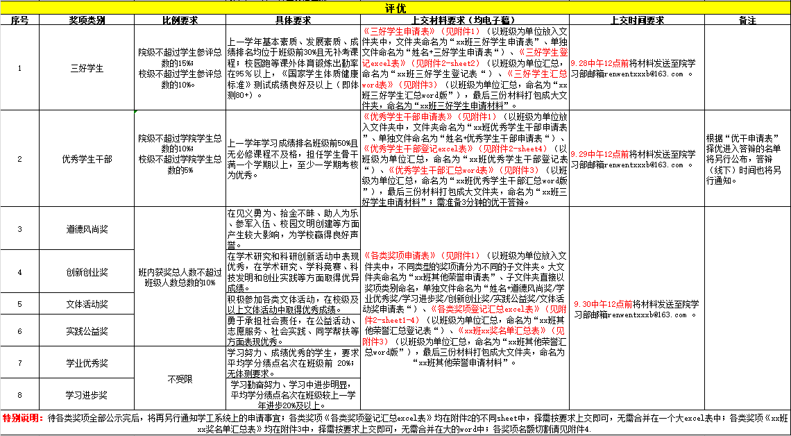 1.各班级要充分认识做好学生评奖评优工作的重要性,要严格按照“评选条件公开、评选名额公开、程序办法公开、评选结果公开”的原则做好各项评选工作,评选过程中要严格按照相关制度和规范流程执。