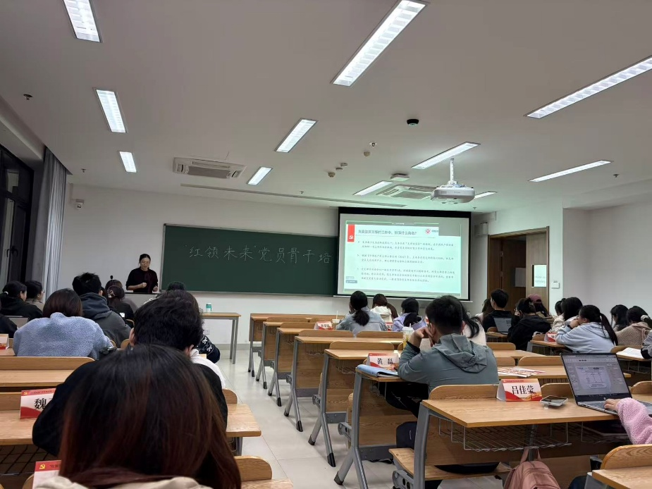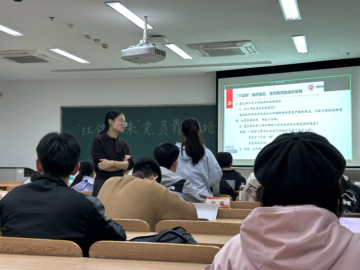 2025年11月9日晚,我校“红领先锋”学生党员骨干培训营第二讲在勤园6号楼409教室顺利举行。本期培训以“支委如何在支部工作中唱主角”为核心主题,色情网站 专职组织员陈晓玲担任主讲,来自各学院的70余名学生党员骨干齐聚一堂,共同开启了一场关于角色、责任与担当的思想盛宴。
